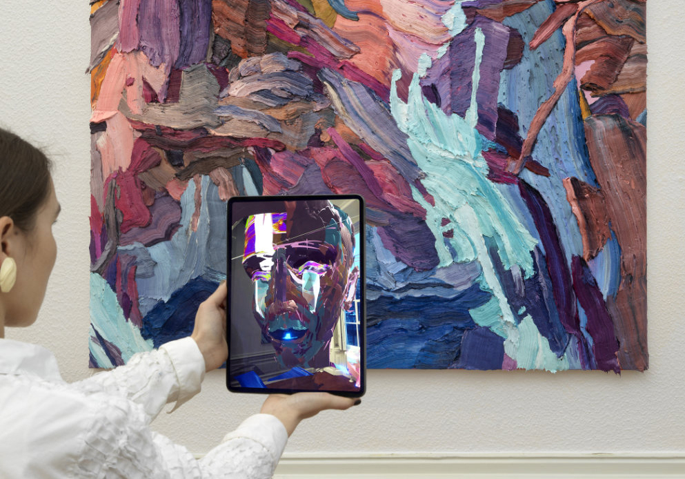 Mit dem VR-Programm OpenBrush malt Dennis Rudolph opulente, von der Mythologie und Stilistik barocker Freskenmalerei inspirierte Figuren im dreidimensionalen digitalen Raum. Abstrakte Ausschnitte dieser Figuren werden von ihm anschließend in pastose, großformatige Ölgemälde oder als Bronzeskulpturen in die reale Welt materialisiert. Diese Werke wiederum können von den Betrachtenden mit einer AR App über das Smartphone zum Leben erweckt werden. Wenn die digitalen Figuren als Hologramme aus dem Gemälde in den Raum schweben, erweist sich das physische Werk als Teil eines größeren digitalen Ganzen und somit als Schwelle zwischen digitaler und physischer Welt.