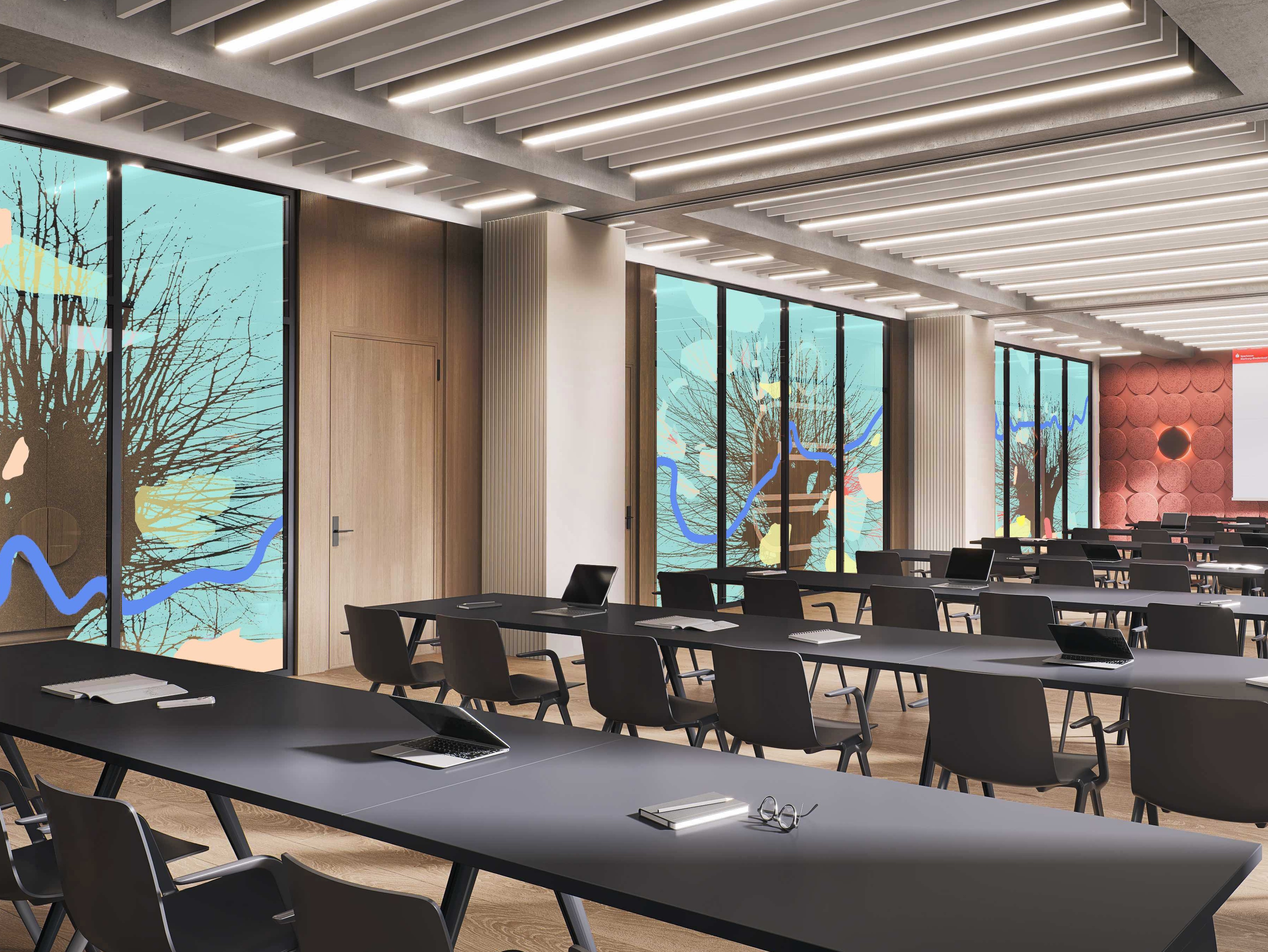 Der kuratorische Fokus von Cornelia Saalfrank liegt auf der regionalen Verankerung der Sparkasse im Landkreis Marburg-Biedenkopf. Ein Panorama von fünf Blickwinkeln auf den Landkreis bildet Themenschwerpunkte und Motive für die künstlerische Ausstattung des Neubaus.